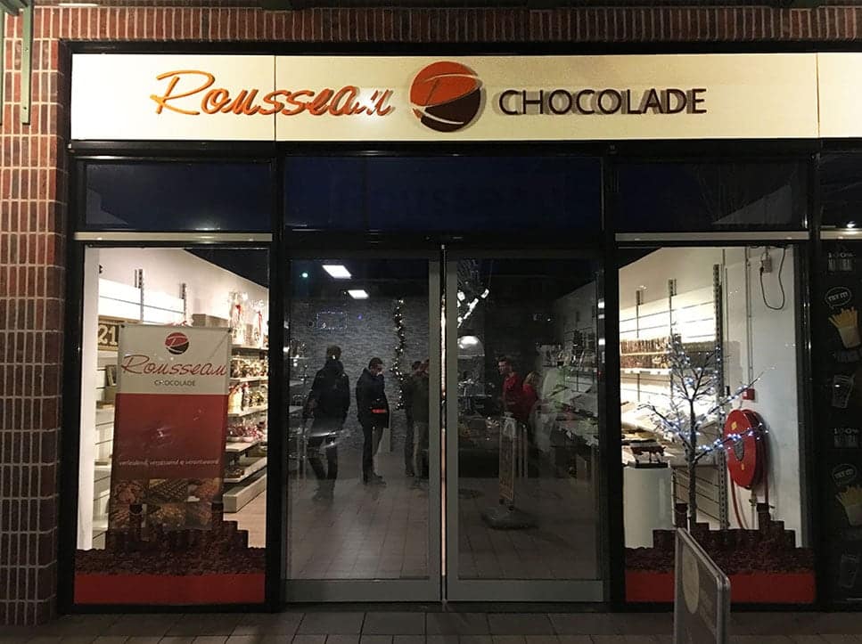 Deze chocolaterie zag graag een chique uitvoering van hun logo tegen de gevel aan. Door reclame letters die uitsteken in hun huisstijl kleuren te frezen en te monteren is dit project geslaagd. De zelfklevende stickers op de onderramen maken de gevelreclame compleet. Laat de klanten nu maar komen.